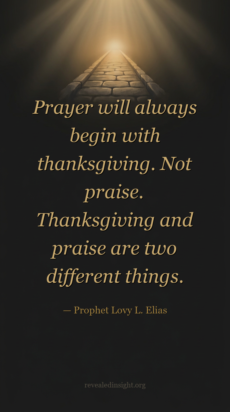 - Prayer must begin with thanksgiving, not praise or worship — thanksgiving is the acknowledgment of who God is that positions you to hear Him and receive from Him.