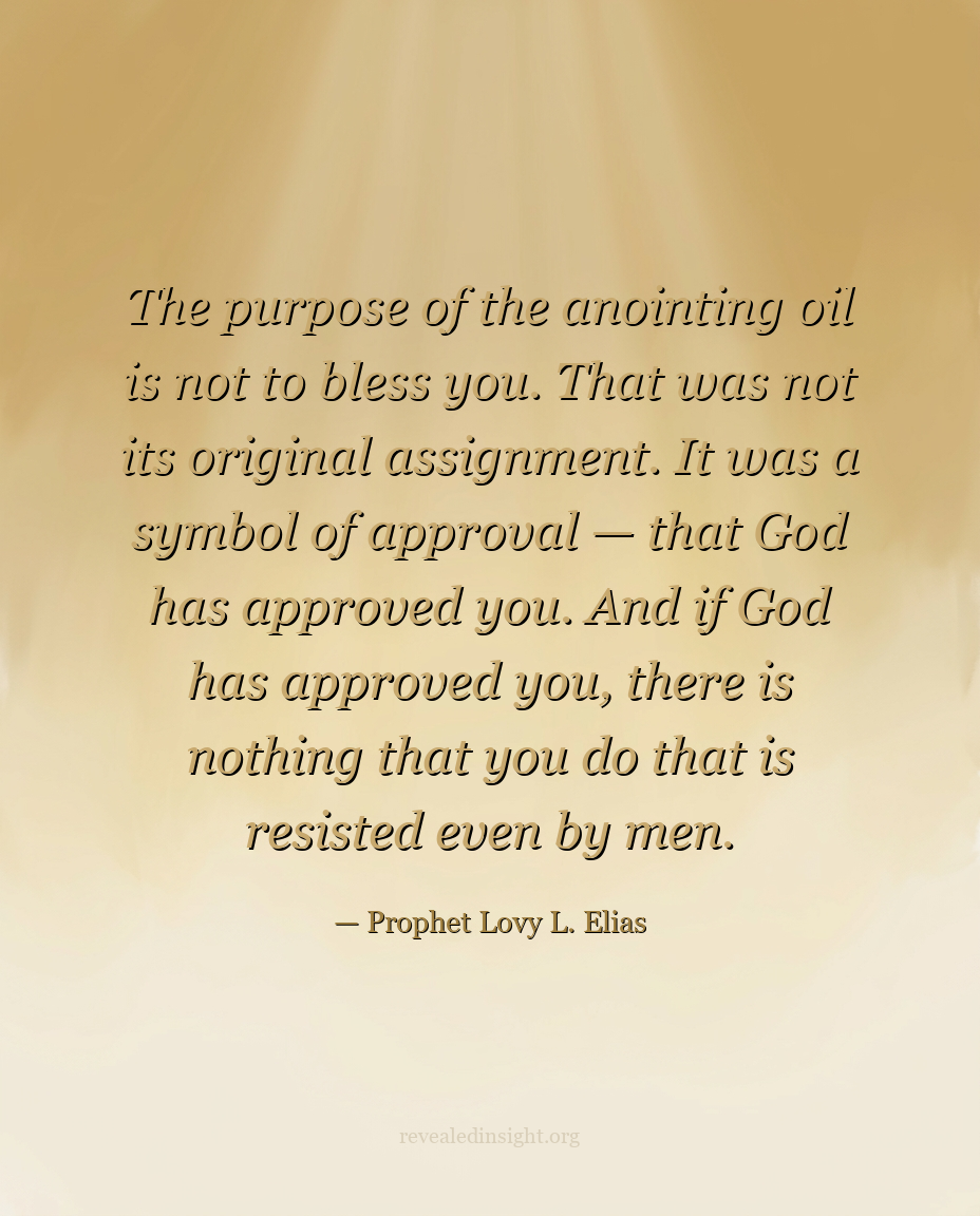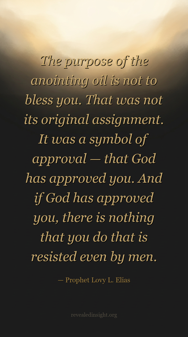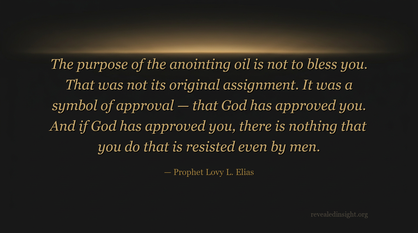 "The purpose of the anointing oil is not to bless you. That was not its original assignment. It was a symbol of approval — that God has approved you. And if God has approved you, there is nothing that you do that is resisted even by men."