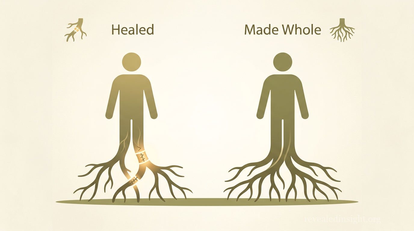 Wholeness — The state of complete restoration that comes when the soul is joined to the Lord in genuine faith and thanksgiving — distinct from healing, which addresses specific need without necessarily engaging the soul.
