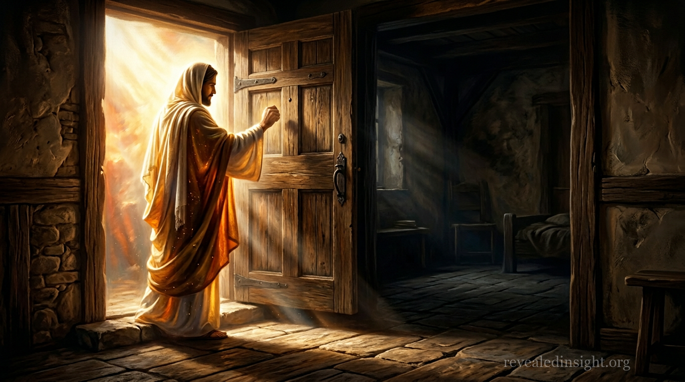 - Revelation 3:20 — "Behold, I stand at the door, and knock: if any man hear my voice, and open the door, I will come in to him, and will sup with him, and he with me." (KJV)