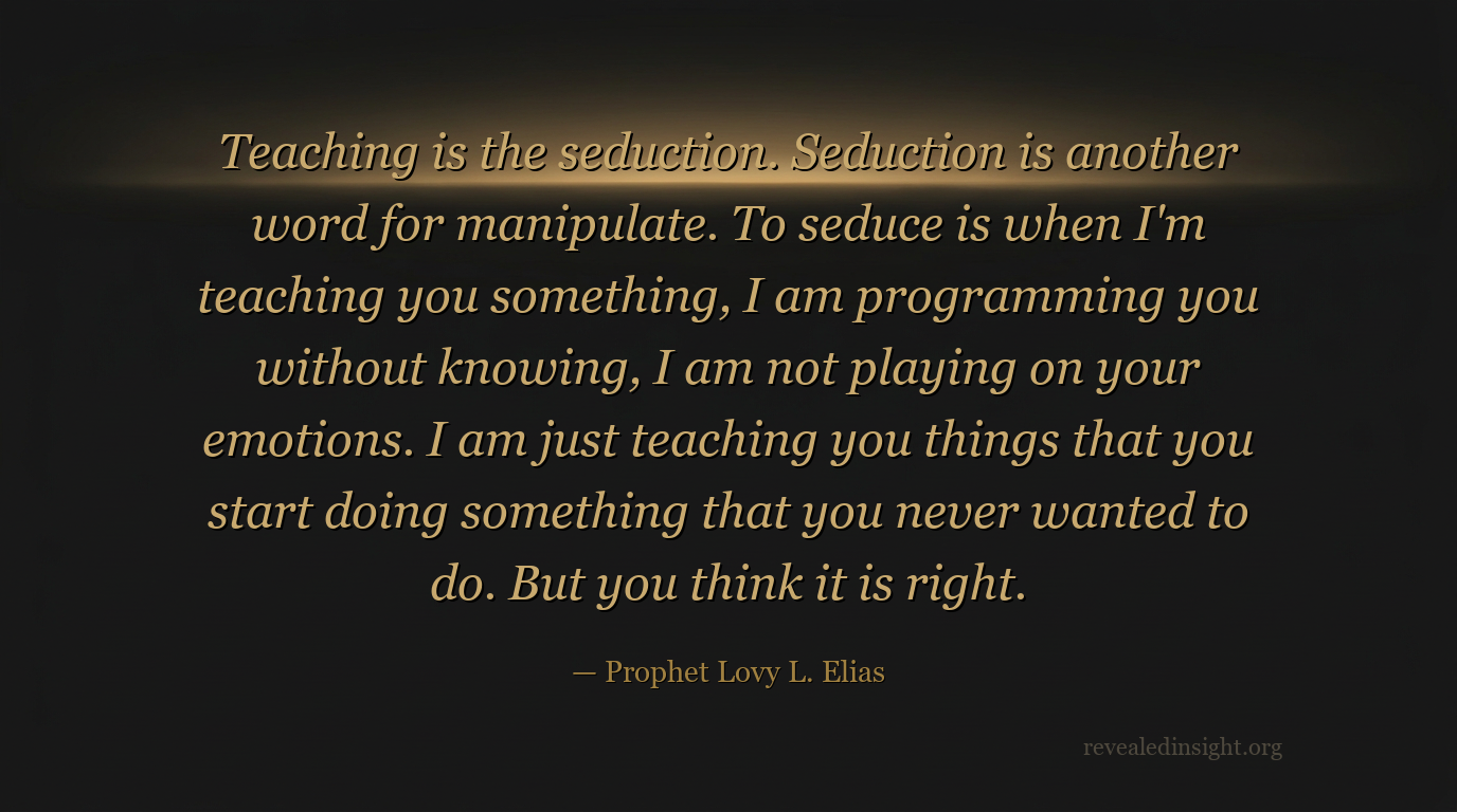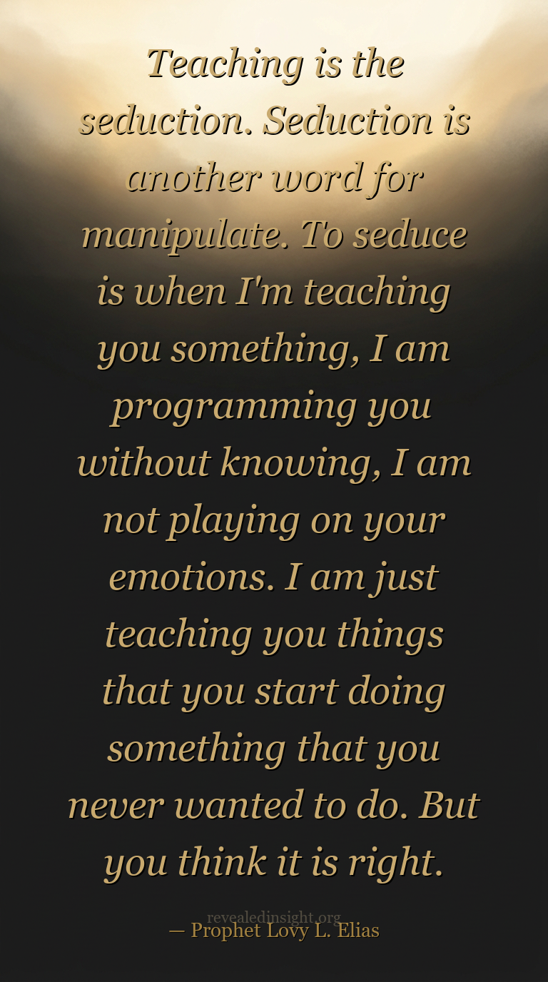 "Teaching is the seduction. Seduction is another word for manipulate. To seduce is when I'm teaching you something, I am programming you without knowing, I am not playing on your emotions. I am just teaching you things that you start doing something that you never wanted to do. But you think it is right."