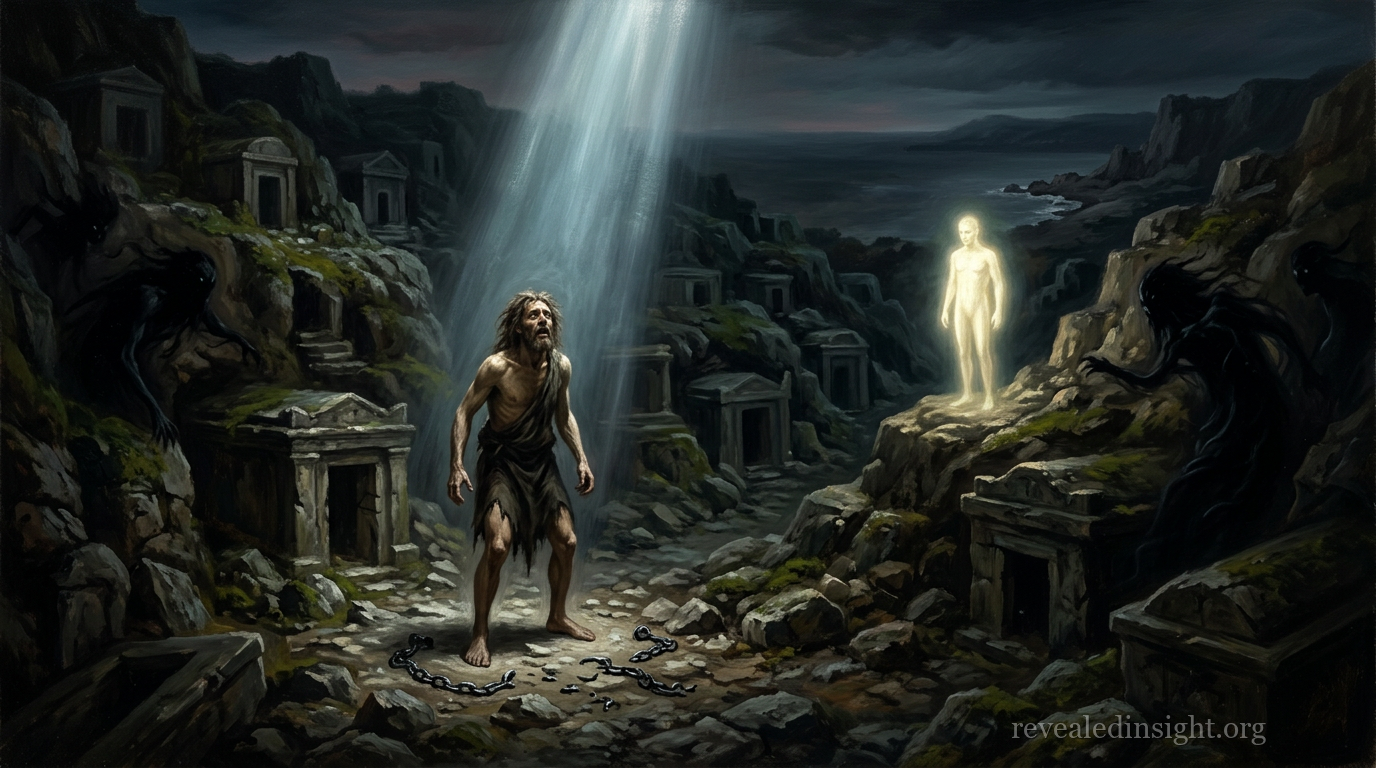 Mark 5:1-5 — "And they came over unto the other side of the sea into the country of the Gadarenes. And when he was come out of the ship, immediately there met him out of the tombs a man with an unclean spirit. Who had his dwelling among the tombs? And no man could bind him, no, not with chains; Because that he had been often bound with fetters and chains, and the chains had been plucked asunder by him, and the fetters broken in pieces: neither could any man tame him. And always, night and day, he was in the mountains, and in the tombs, crying, and cutting himself with stones." (KJV)